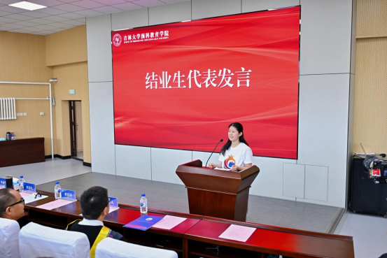 2025届结业生代表朱宏扬同学发言。她回顾了这一年短暂而充实的预科时光,感谢学院提供的丰富教学资源和优质师资力量,让同学们能够在逐梦路上坚实起步。她号召同学们“永葆求知热忱,在专业领域追求卓越;厚植家国情怀,怀揣预科收获的成长与自信,勇赴人生新征程。”